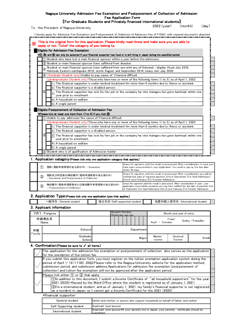 Nagoya University Admission Fee Exemption and Postponement of Collection of Admission Fee Application Form For Graduate Students and Privately financed international students 2022 (year) (month) (day)