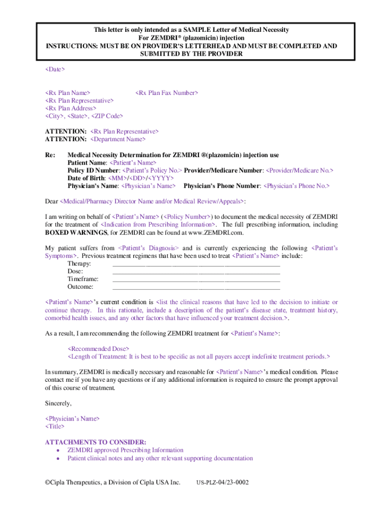 This letter is only intended as a SAMPLE Letter of Medical Necessity For MEMORY (plazomicin) injection INSTRUCTIONS: MUST BE ON PROVIDERS LETTERHEAD AND MUST BE COMPLETED AND SUBMITTED BY THE PROVIDER