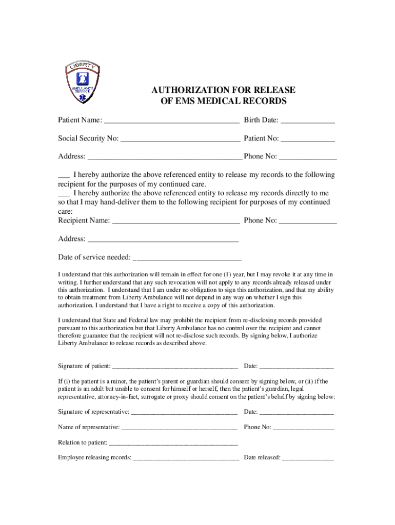 AUTHORIZATION FOR RELEASE OF EMS MEDICAL RECORDS Patient Name: ___ Birth Date: ___ Social Security No: ___ Patient No: ___ Address: ___ Phone No: ___ ___ I hereby authorize the above referenced entity