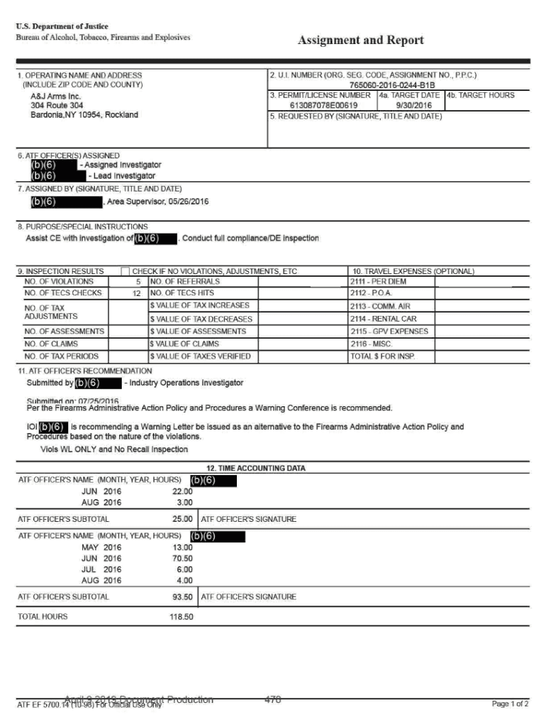 U.S. Department of Justice Bureau of Alcohol. Tobacco. Firearms and ExplosivesAssignment and Report 2. U.I. NUMBER (ORG. SEG. CODE, ASSIGNMENT NO., P.C.) 76506020160244B1B 3 PERMIT/LICENSE NUMBER