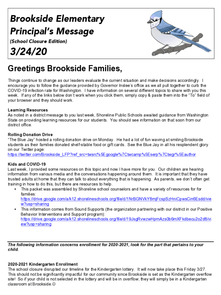 Brookside Elementary Principals Message (School Closure Edition)3/24/20Greetings Brookside Families, Things continue to change as our leaders evaluate the current situation and make decisions accordingly.