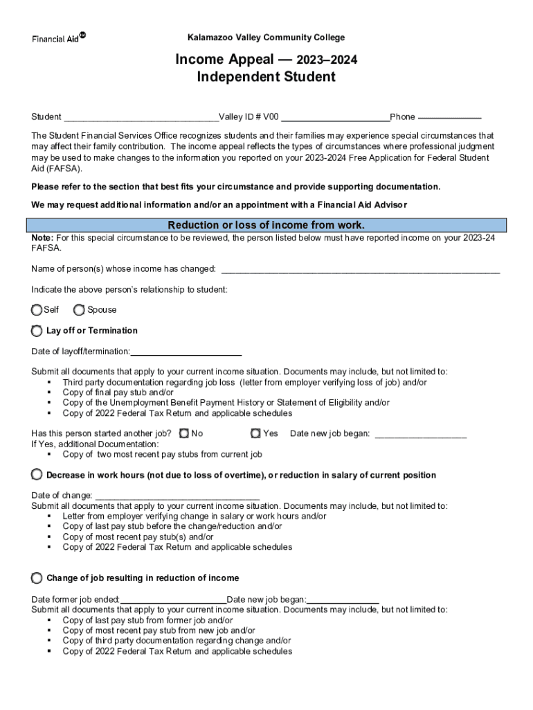 Kalamazoo Valley Community CollegeIncome Appeal 20232024 Independent Student ___Valley ID # V00 ______Phonetic Student Financial Services Office recognizes students and their families may experience