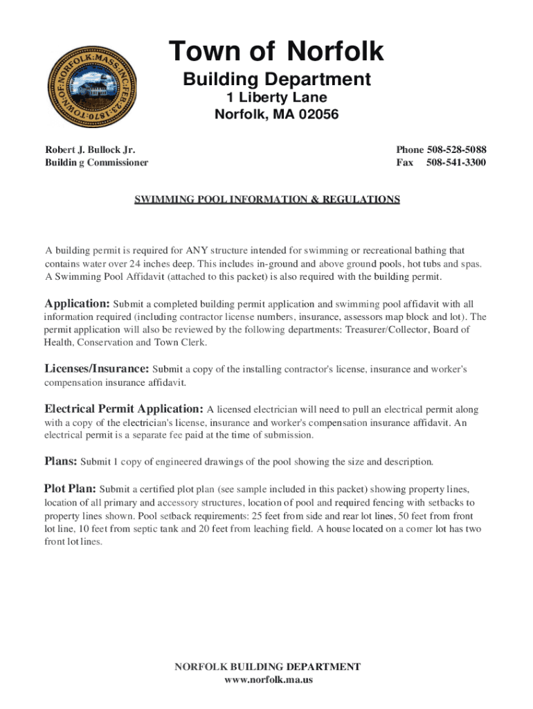 Town of Norfolk Building Department 1 Liberty Lane Norfolk, MA 02056 Robert J. Bullock Jr. Building CommissionerPhone 5085285088 Fax 5085413300SWIMMING POOL INFORMATION & REGULATIONS building permit