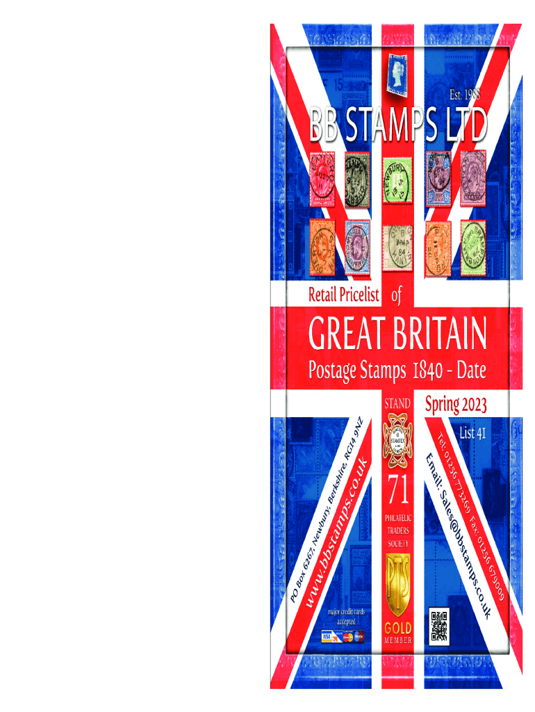BB Stamps Spring 2023 covers.exp_Layout 1 21/02/2023 13:23 Page 1BB Stamps Ltd. Retail Price list of Great Britain Postage Stamps 1840 Catering 2023BB Stamps Spring 2023 covers.exp_Layout 1 21/02/2023