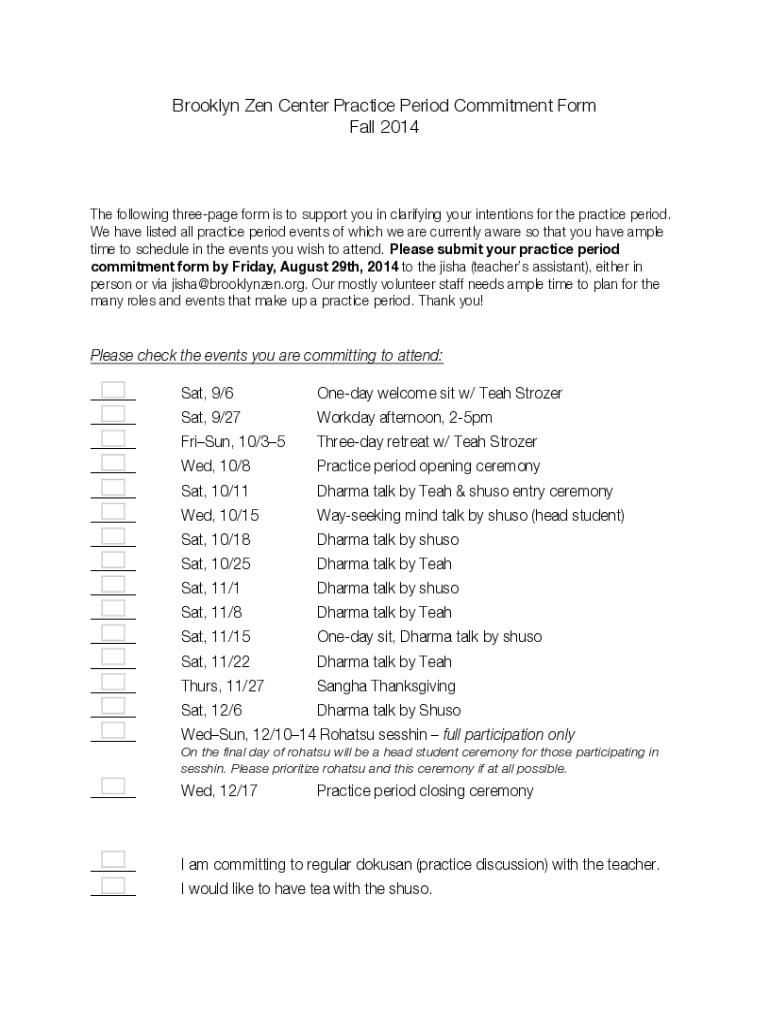 Get the free Brooklyn Zen Center Practice Period Commitment Form ...