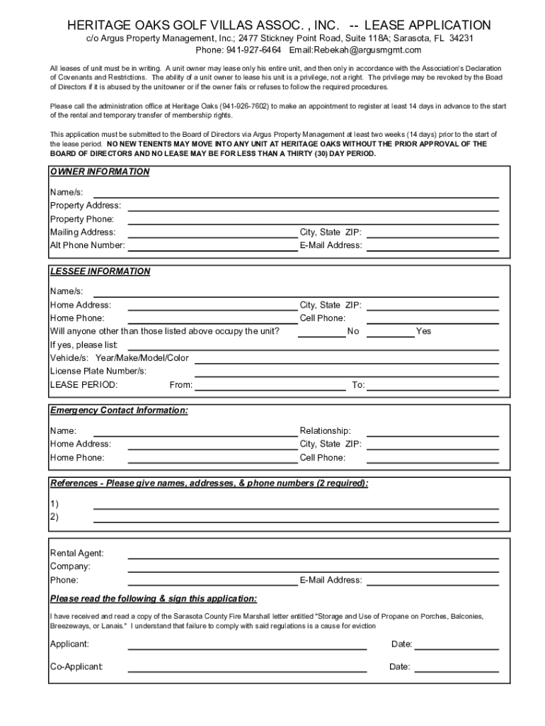 HERITAGE OAKS GOLF VILLAS ASSOC. , INC. LEASE APPLICATION c/o Argus Property Management, Inc.; 2477 Sticker Point Road, Suite 118A; Sarasota, FL 34231 Phone: 9419276464 Email:Rebekah@argusmgmt.com