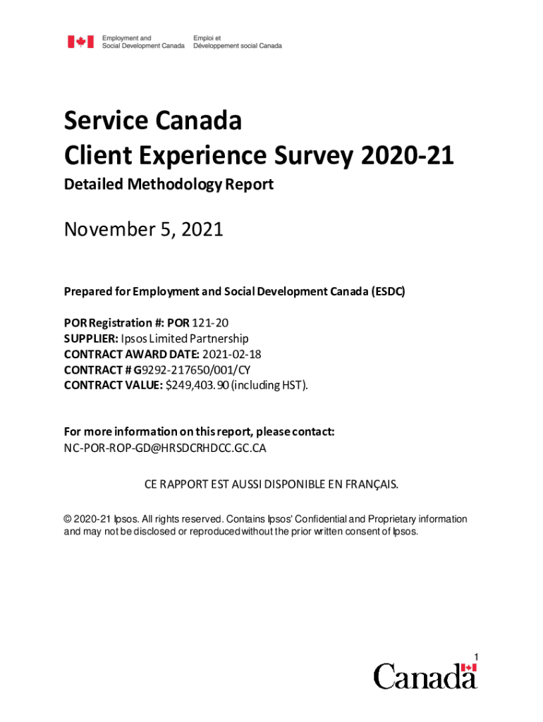 Service Canada Client Experience Survey 202021 Detailed Methodology Report November 5, 2021, Prepared for Employment and Social Development Canada (ESC) POR Registration #: POR 12120 SUPPLIER: Dipsos
