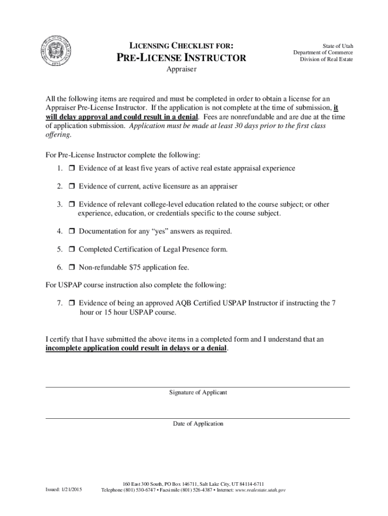 Get the free Apply for an Appraiser Pre-License Instructor - realestate utah