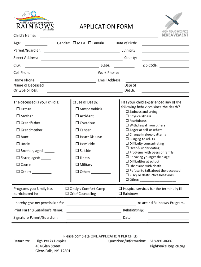 APPLICATION FORM Child's Name: Gender: Male Females:Date of Birth:Parent/Guardian:Ethnicity:Street Address:County:City:State:Zip Code:Cell Phone:Work Phone:Home Phone: Name of Deceased Or type of