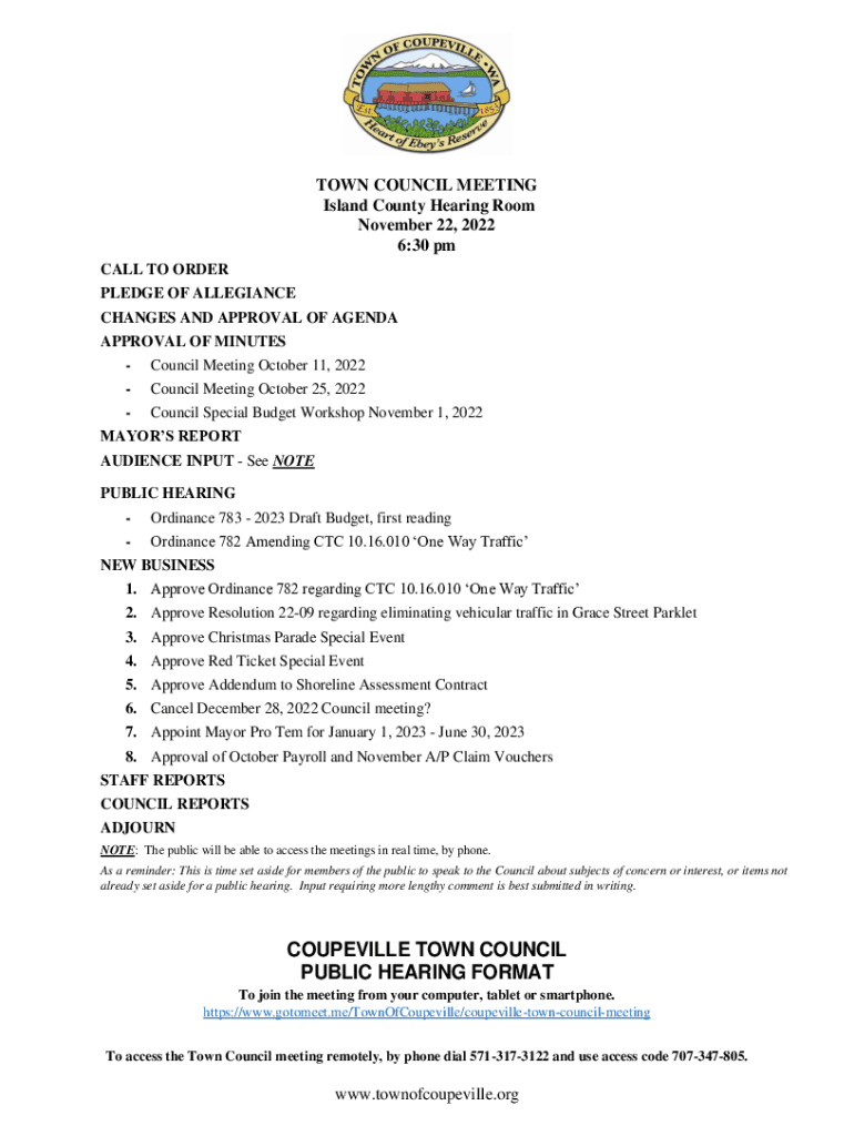 TOWN COUNCIL MEETING Island County Hearing Room November 22, 2022 6:30 pm CALL TO ORDER PLEDGE OF ALLEGIANCE CHANGES AND APPROVAL OF AGENDA APPROVAL OF MINUTES Council Meeting October 11, 2022Council