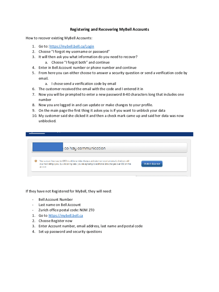 Registering and Recovering My Bell Accounts How to recover existing My Bell Accounts: 1. Go to: https://mybell.bell.ca/Login 2. Choose I forgot my username or password 3. It will then ask you what