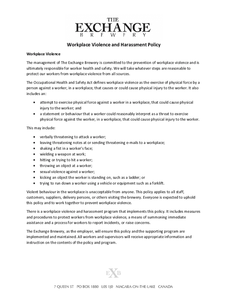 Workplace Violence and Harassment Policy Workplace Violence The management of The Exchange Brewery is committed to the prevention of workplace violence and is ultimately responsible for worker health