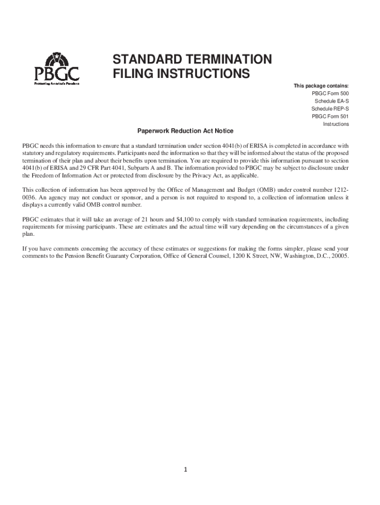 STANDARD TERMINATION FILING INSTRUCTIONS This package contains: PGC Form 500 Schedule EAS Schedule REPS PGC Form 501 InstructionsPaperwork Reduction Act Notice PGC needs this information to ensure