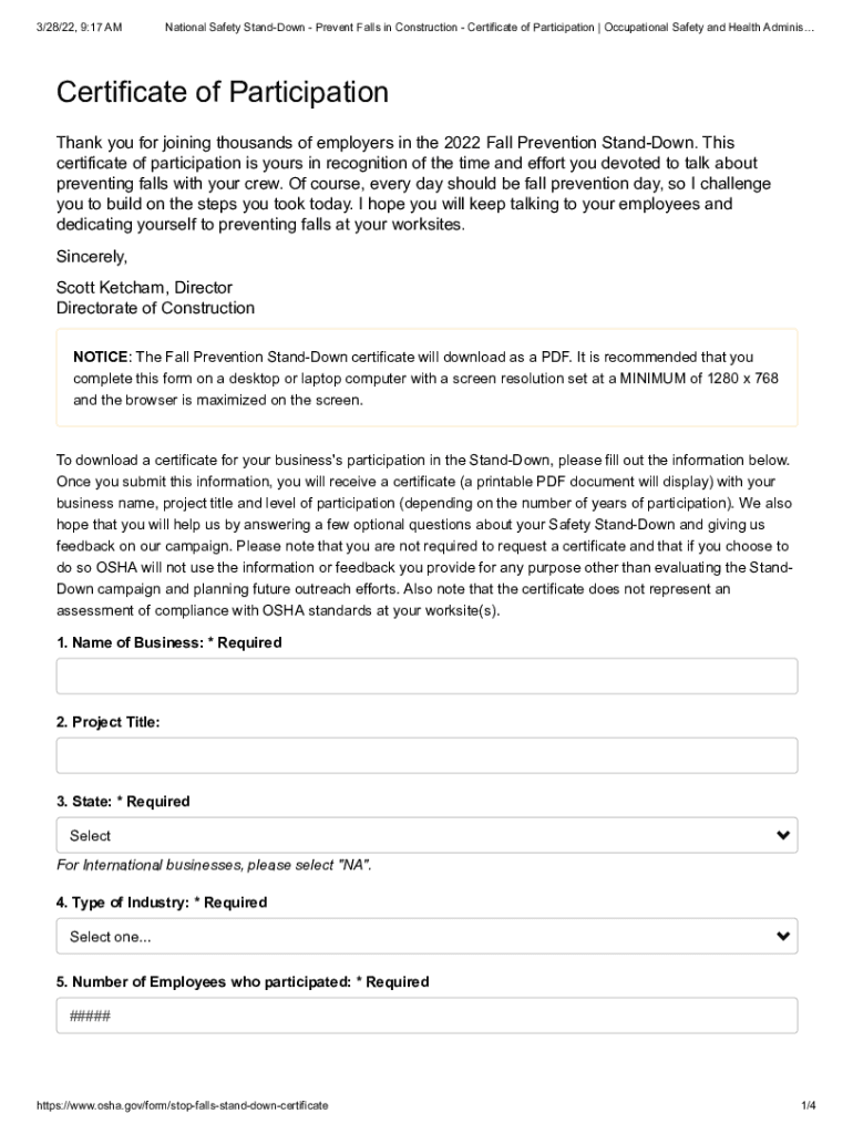 3/28/22, 9:17 National Safety Shakedown Prevent Falls in Construction Certificate of Participation | Occupational Safety and Health AdminisCertificate of Participation