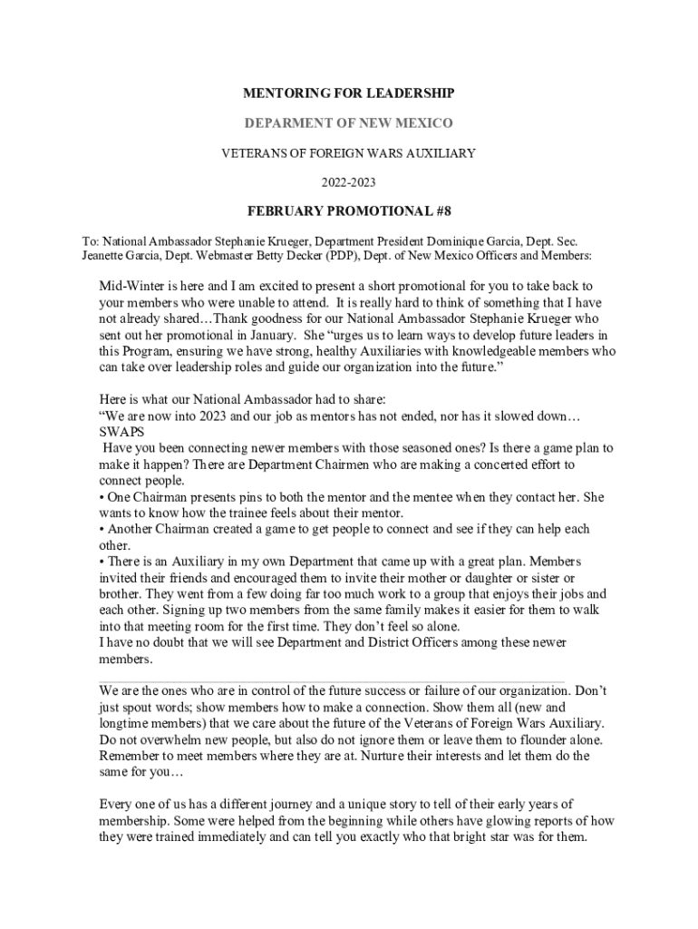 MENTORING FOR LEADERSHIP DEPARTMENT OF NEW MEXICO VETERANS OF FOREIGN WARS AUXILIARY 20222023FEBRUARY PROMOTIONAL #8 To: National Ambassador Stephanie Krueger, Department President Dominique Garcia,
