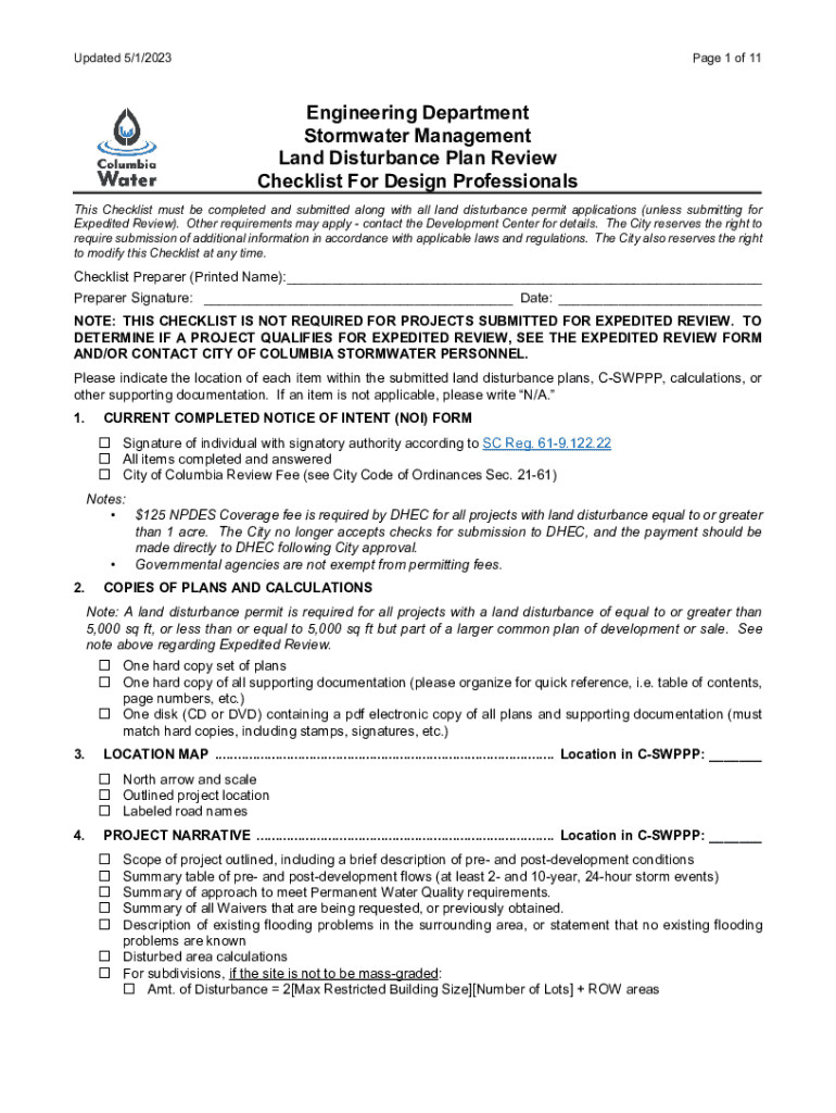 Updated 5/1/2023Page 1 of 11Engineering Department Stormwater Management Land Disturbance Plan Review Checklist For Design Professionals This Checklist must be completed and submitted along with all