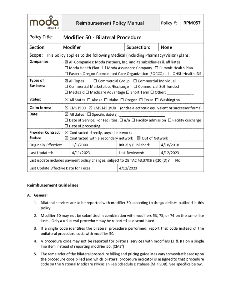 Reimbursement Policy Manual Policy Title:Modifier 50 Bilateral ProcedureSection:ModifierSubsection:Policy #:RPM057NoneScope: This policy applies to the following Medical (including Pharmacy/Vision)
