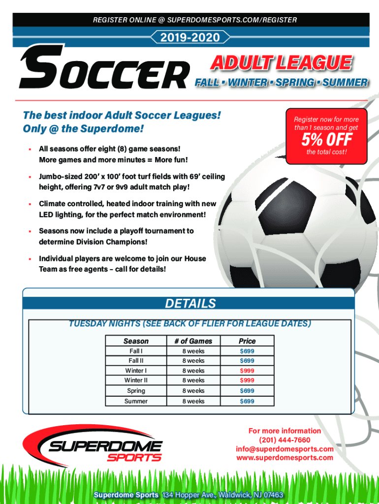 REGISTER ONLINE @ SUPERDOMESPORTS.COM/REGISTER20192020ADULT LEAGUEFALL WINTER SPRING Summertime the best indoor Adult Soccer Leagues! Only @ the Super dome! Register now for more than 1 season and