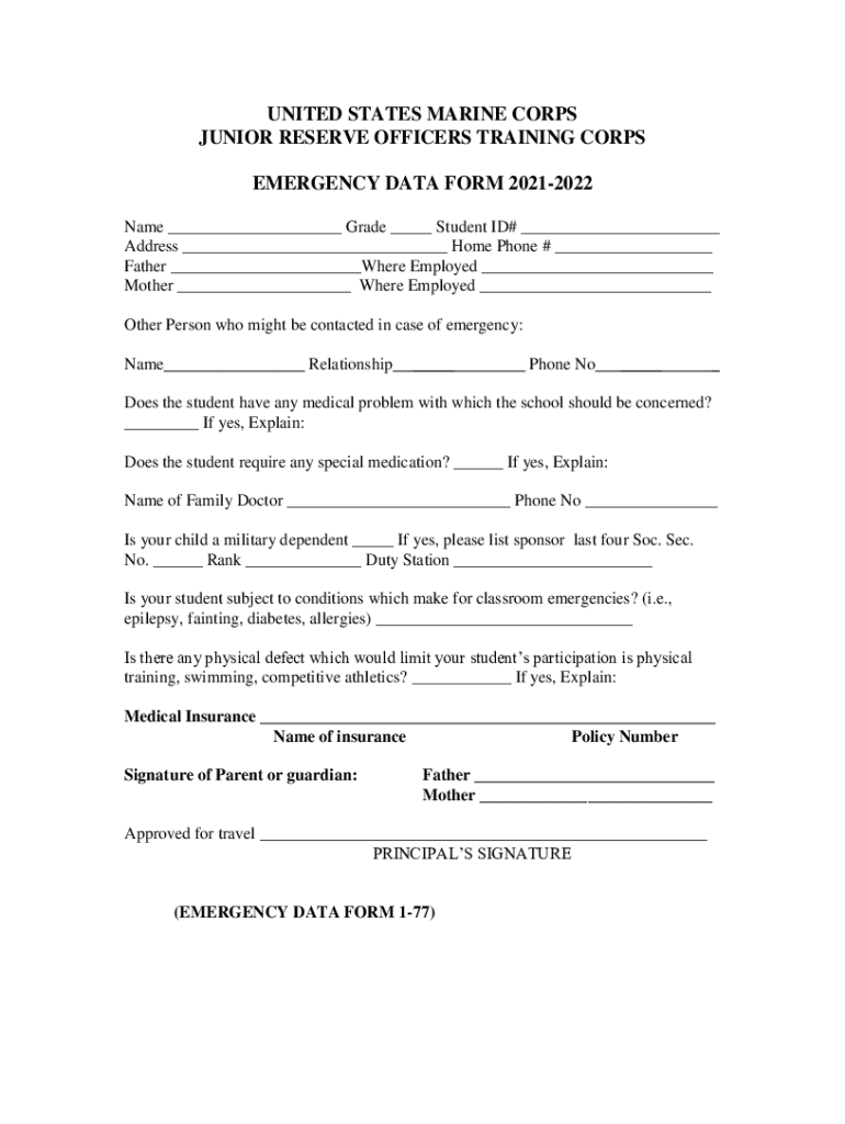 UNITED STATES MARINE CORPS JUNIOR RESERVE OFFICERS TRAINING CORPS EMERGENCY DATA FORM 20212022 Name ___ Grade ___ Student ID# ___ Address ___ Home Phone # ___ Father ___Where Employed ___ Mother ___