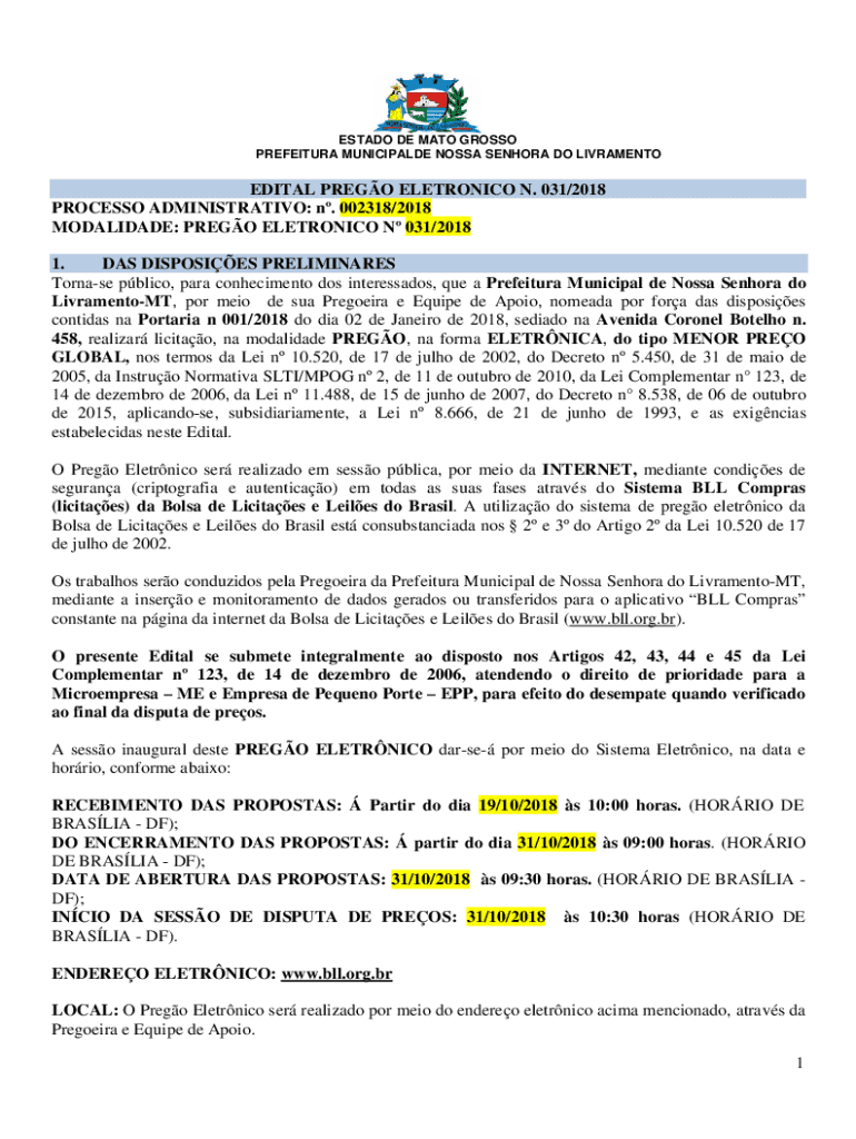 PREFECTURE MUNICIPAL DE FOSSA Señora DO LIVRAMENTOEDITAL PRESO ELECTRONIC N. 031/2018