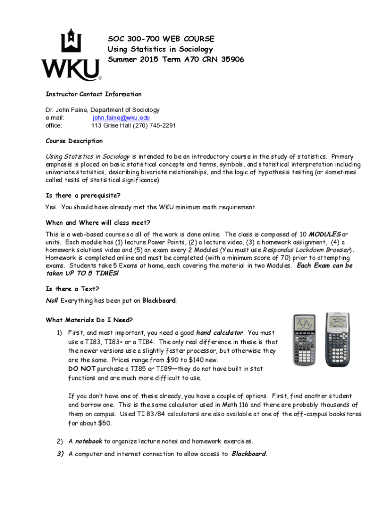 SOC 300700 WEB COURSE Using Statistics in Sociology Summer 2015 Term A70 CRN 35906Instructor Contact Information Dr. John Fine, Department of Sociology e-mail: john.faine@wku.edu office: 113 Rise