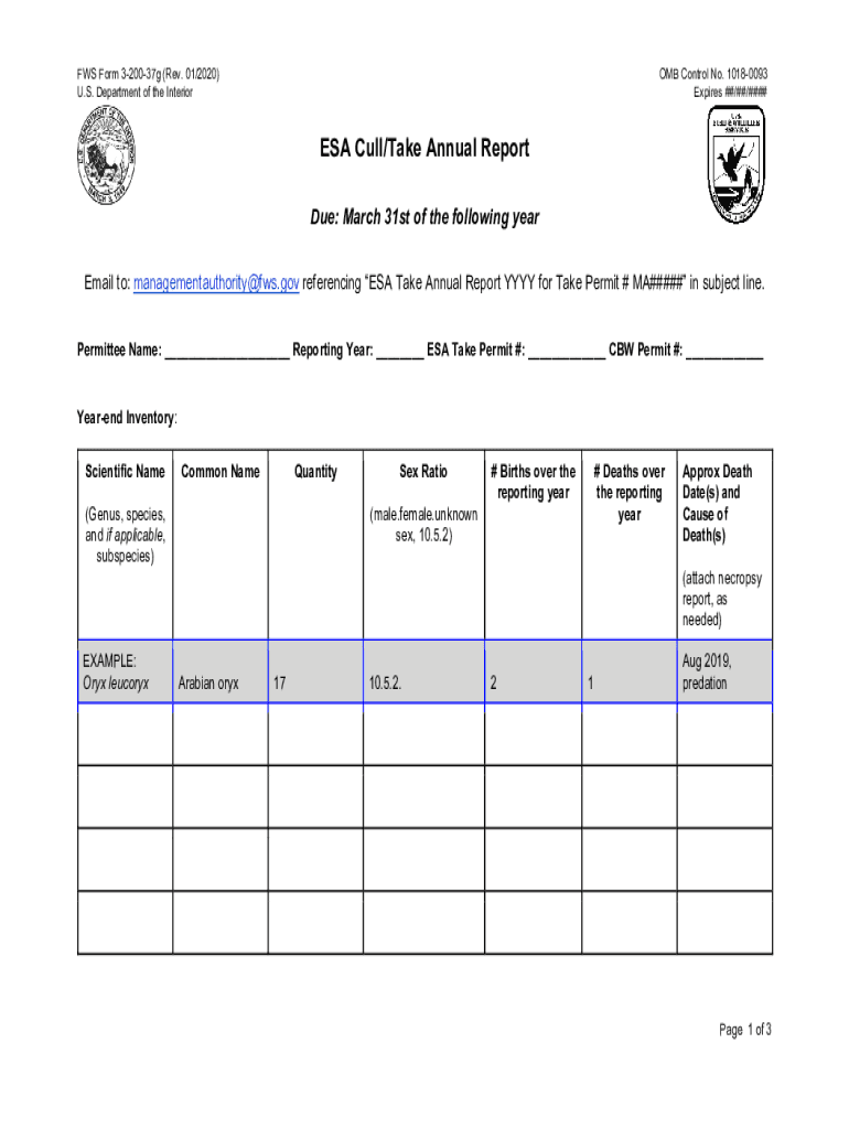 FRS Form 320037g (Rev. 01/2020) U.S. Department of the Interior OMB Control No. 10180093 Expires ##/##/####ESA Cull/Take Annual Report Due: March 31st of the following year Email to: managementauthority@fws.gov