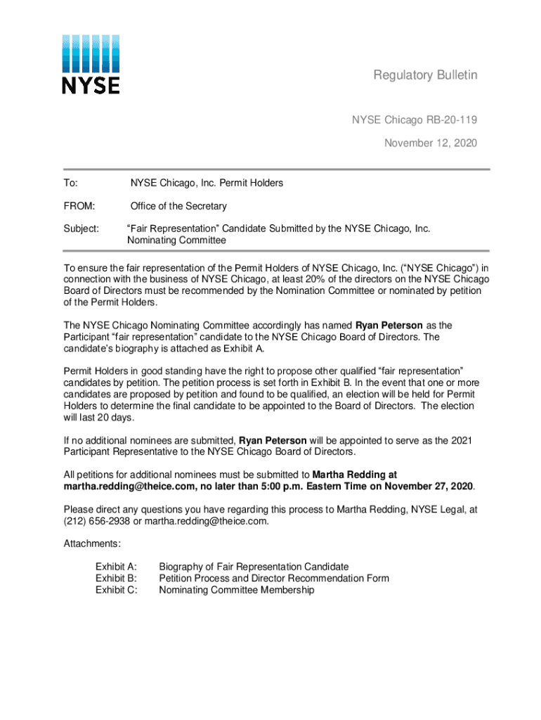 [Type here]Regulatory Bulletin NYSE Chicago RB20119 November 12, 2020To:NYSE Chicago, Inc. Permit HoldersFROM:Office of the SecretarySubject:Fair Representation Candidate Submitted by the NYSE Chicago,