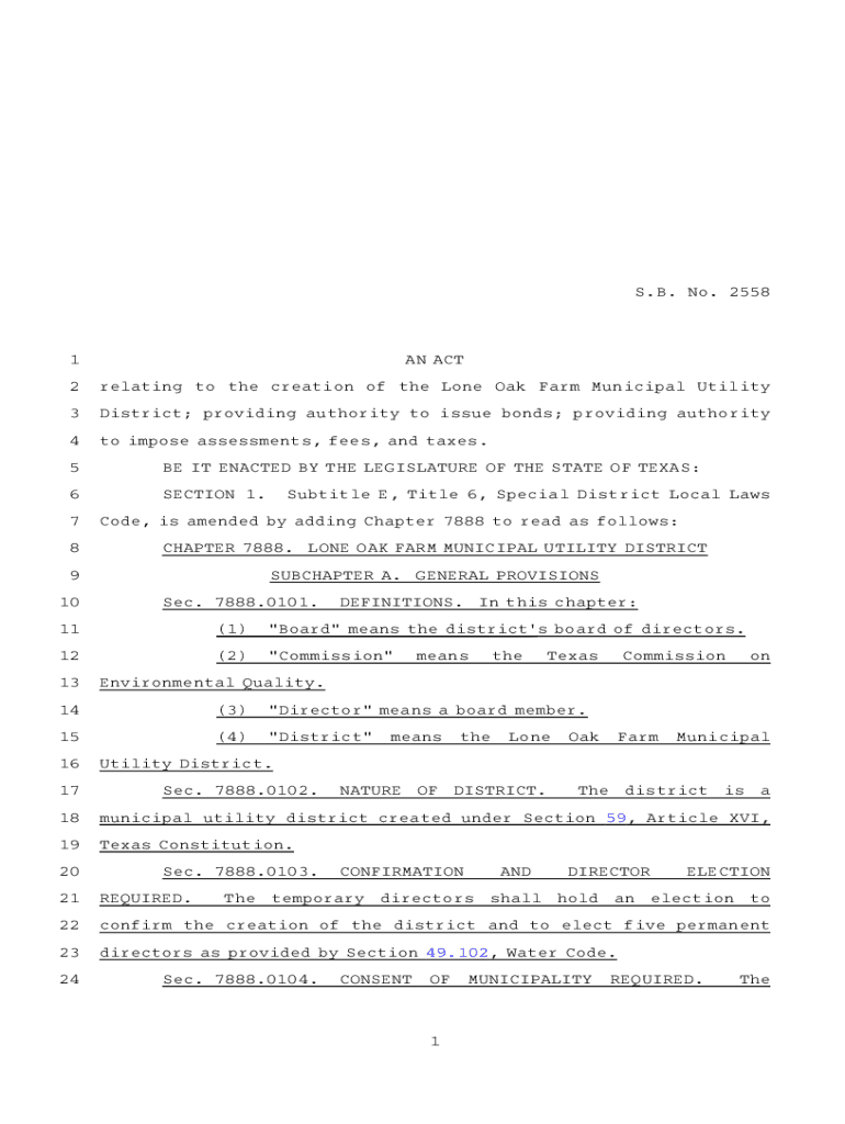 S.B.ANO. A25581AN ACT2relating to the creation of the Lone Oak Farm Municipal Utility3District; providing authority to issue bonds; providing authority4to impose assessments, fees, and taxes.5BE IT