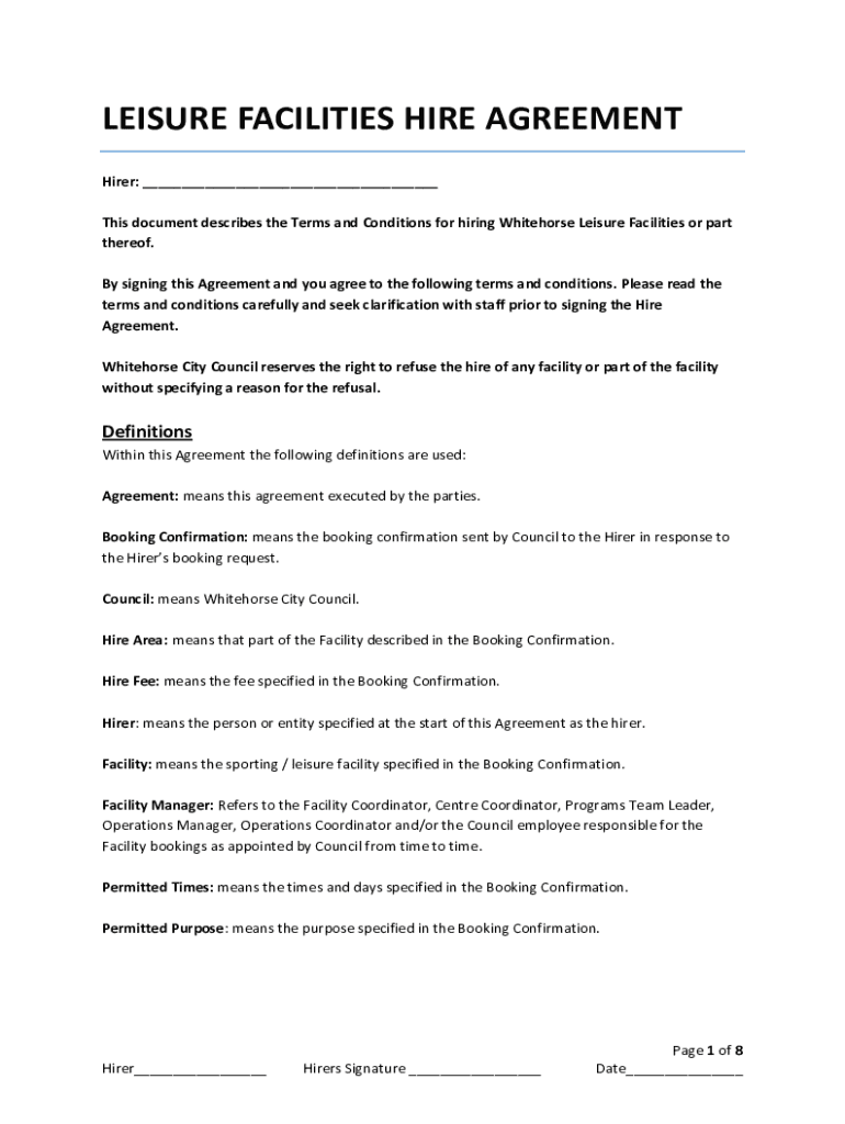 LEISURE FACILITIES HIRE AGREEMENT Hired: ___ This document describes the Terms and Conditions for hiring Whitehorse Leisure Facilities or part thereof. By signing this Agreement and you agree to the