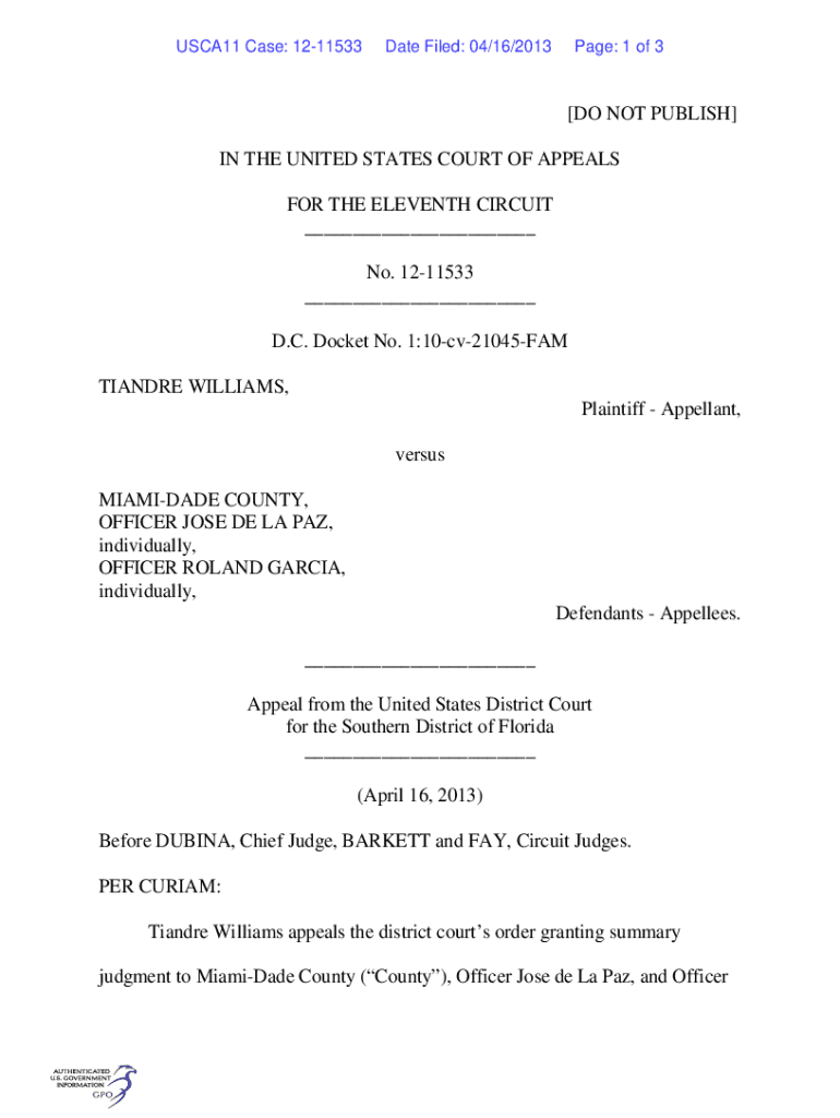 USCA11 Case: 1211533Date Filed: 04/16/2013Page: 1 of 3[DO NOT PUBLISH] IN THE UNITED STATES COURT OF APPEALS FOR THE ELEVENTH CIRCUIT ___ No. 1211533 ___ D.C. Docket No. 1:10cv21045FAM ANDRE WILLIAMS,
