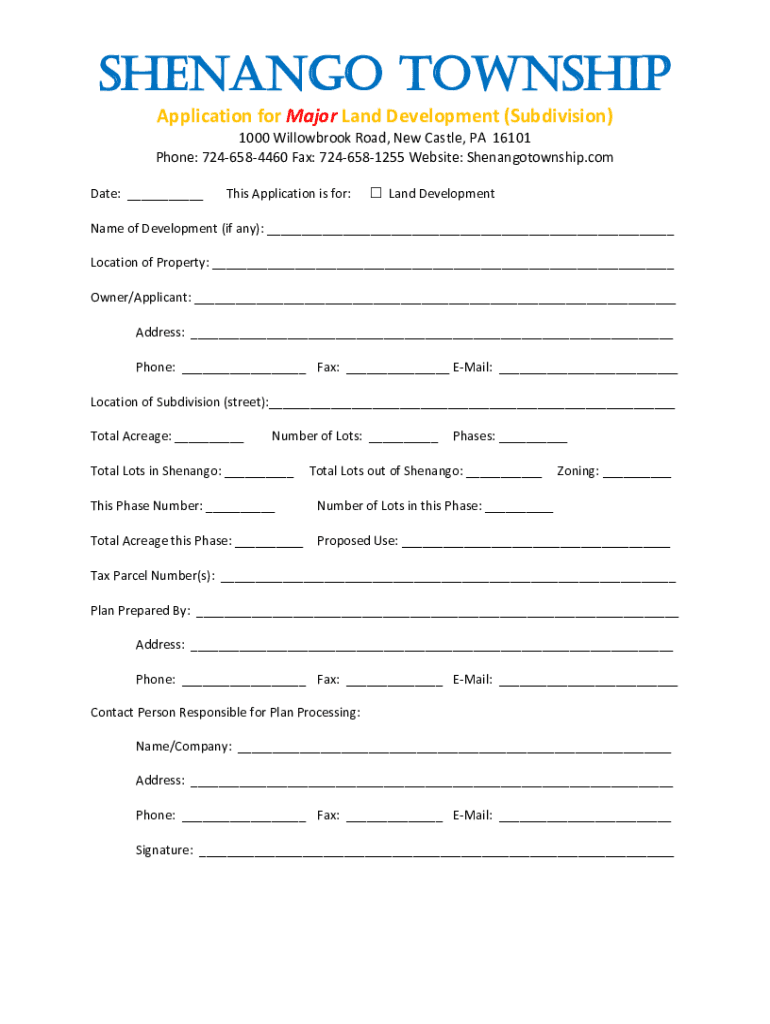 SHENYANG TOWNSHIP Application for Major Land Development (Subdivision) 1000 Willowbrook Road, New Castle, PA 16101 Phone: 7246584460 Fax: 7246581255 Website: Shenangotownship.com Date: ___This Application