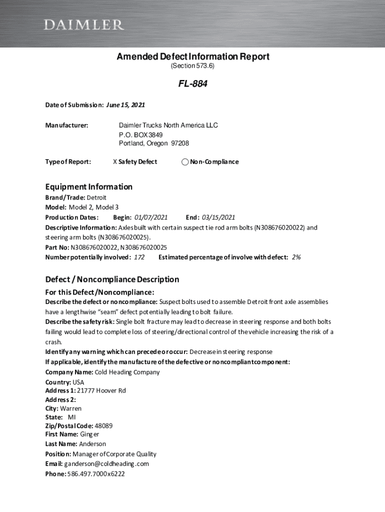 Amended Defect Information Report (Section 573.6)FL884 Date of Submission: June 15, 2021, Manufacturer:Type of Report:Daimler Trucks North America LLC P.O. BOX 3849 Portland, Oregon 97208X Safety