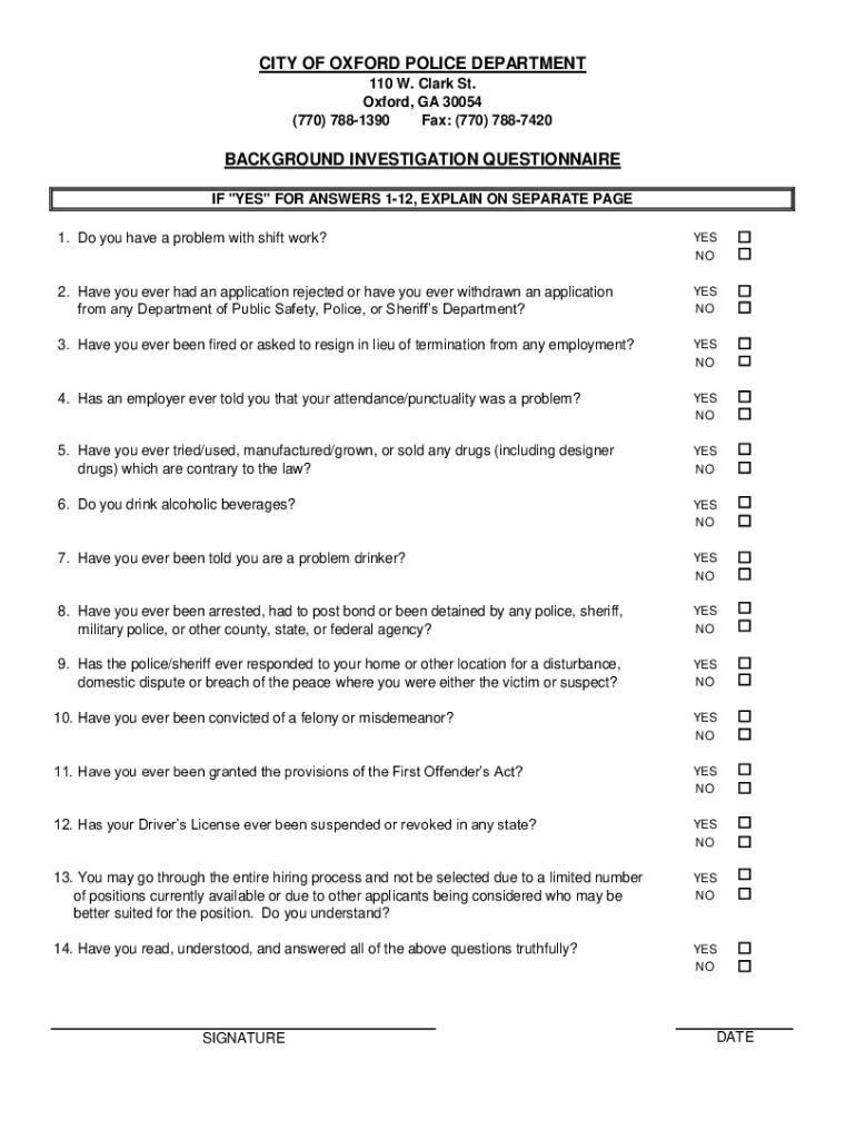 CITY OF OXFORD POLICE DEPARTMENT 110 W. Clark St. Oxford, GA 30054 (770) 7881390 Fax: (770) 7887420BACKGROUND INVESTIGATION QUESTIONNAIRE IF \” YES\” FOR ANSWERS 112, EXPLAIN ON SEPARATE PAGE
