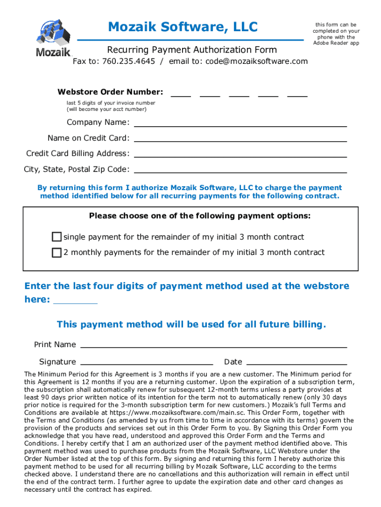 Movie Software, LLC Recurring Payment Authorization Form this form can be completed on your phone with the Adobe Reader appear to: 760.235.4645 / email to: code@mozaiksoftware.comWebstore Order Number: