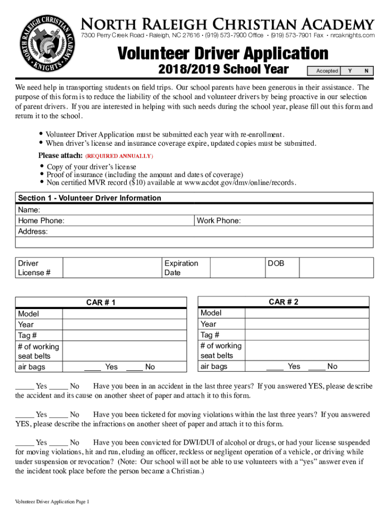 7300 Perry Creek Road Raleigh, NC 27616 (919) 5737900 Office (919) 5737901 Fax nrcaknights. Volunteer Driver Application19962018/2019 School YearAcceptedYNWe need help