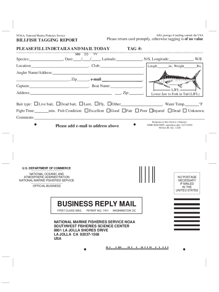 Affix postage if mailing outside the USA NOAA, National Marine Fisheries ServicePlease return card promptly, otherwise tagging is of no valueBILLFISH TAGGING REPORTPLEASE FILL IN DETAILS AND MAIL