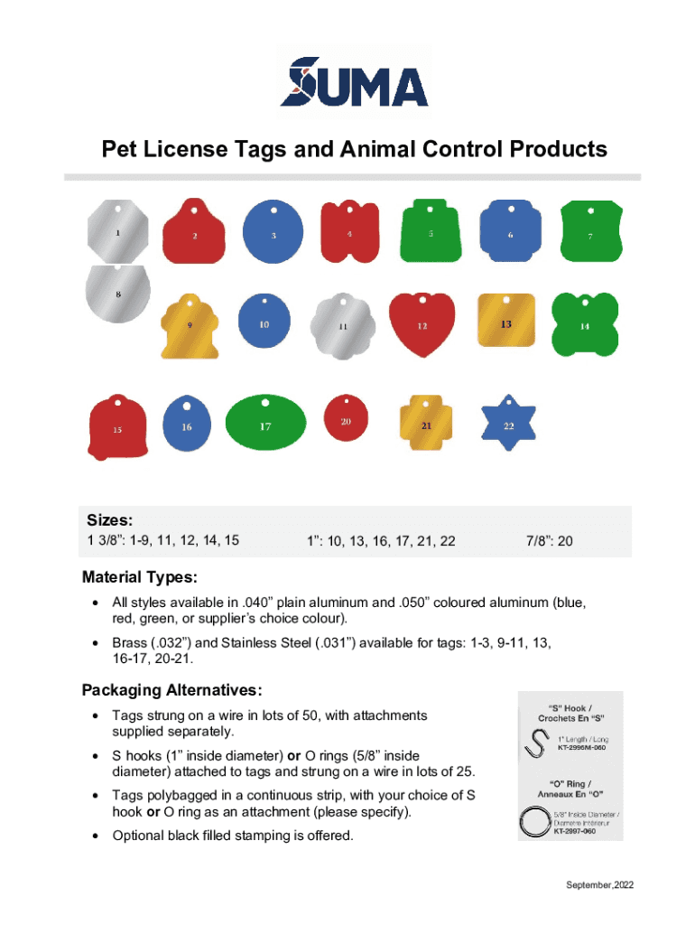 Pet License Tags and Animal Control ProductsSizes:1 3/8: 19, 11, 12, 14, 151: 10, 13, 16, 17, 21, 227/8: 20Material Types: All styles available in .040 plain aluminum and .050 colored aluminum (blue,