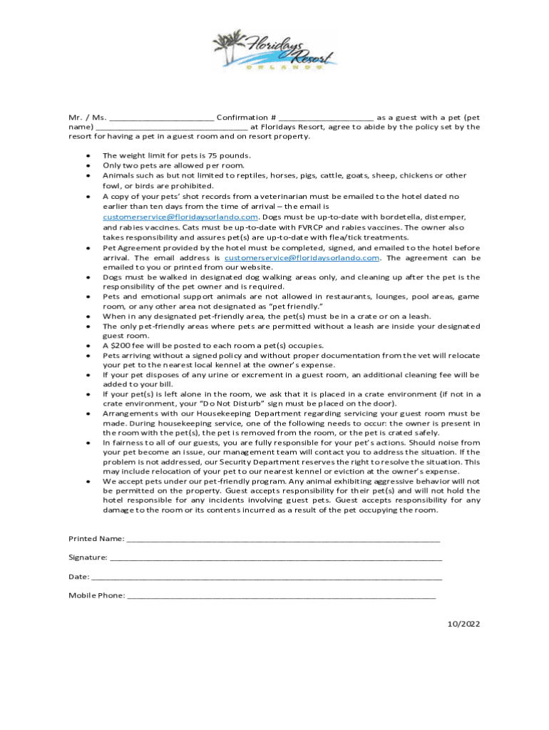 Mr. / Ms. ___ Confirmation # ___ as a guest with a pet (pet name) ___ at Florida Resort, agree to abide by the policy set by the resort for having a pet in a guest room and on resort property. The