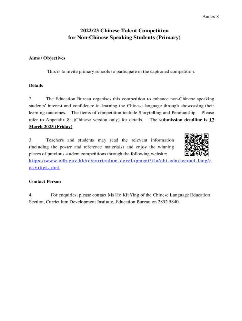 Annex 82022/23 Chinese Talent Competition for NonChinese Speaking Students (Primary)Aims / Objectives This is to invite primary schools to participate in the captioned competition. Details 2. The
