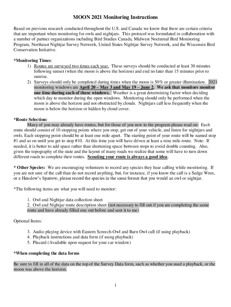MOON 2021 Monitoring Instructions Based on previous research conducted throughout the U.S. and Canada we know that there are certain criteria that are important when monitoring for owls and night