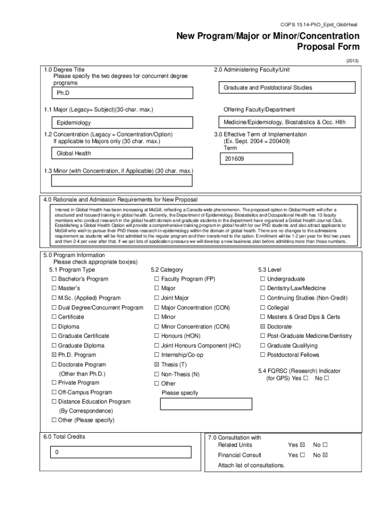 CAPS.15.14PhD_Epic_GlobHealNew Program/Major or Minor/Concentration Proposal Form (2013)1.0 Degree Title Please specify the two degrees for concurrent degree programs2.0 Administering Faculty/Unit