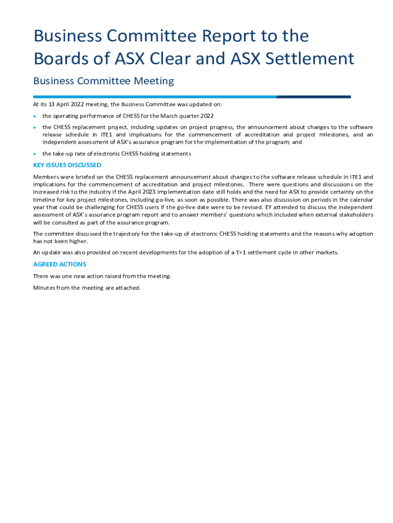 Business Committee Report to the Boards of ASX Clear and ASX Settlement Business Committee Meeting At its 13 April 2022 meeting, the Business Committee was updated on: the operating performance of