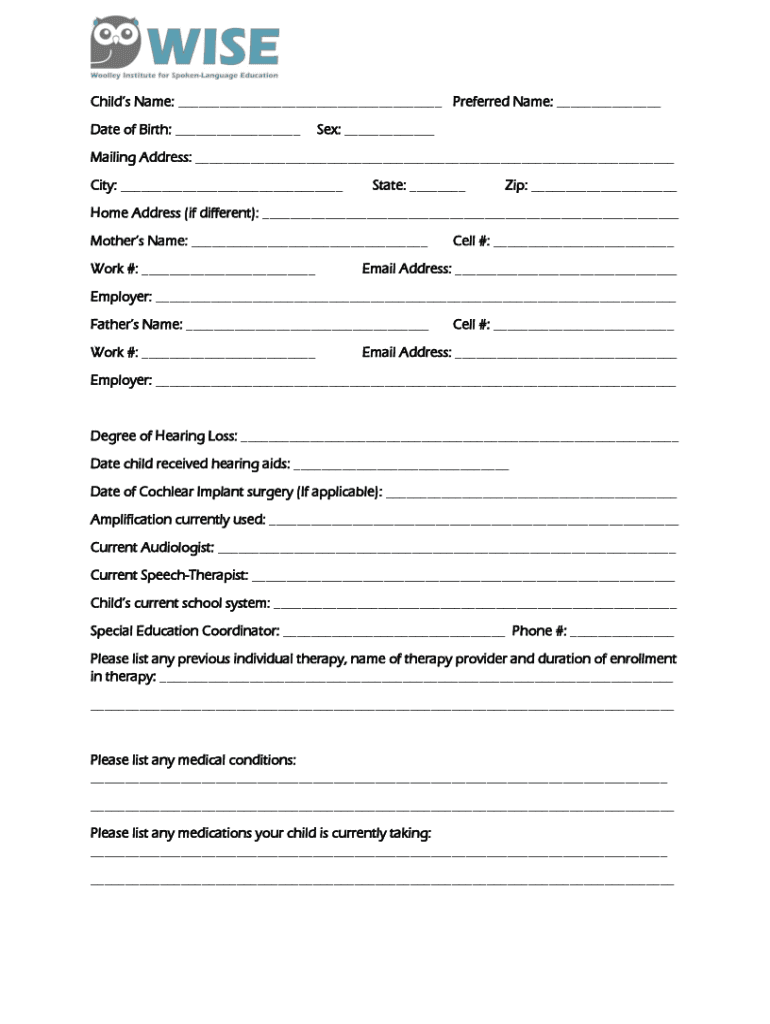 Child's Name: ___ Preferred Name: ___ Date of Birth: ___Sex: ___Mailing Address: ___ City: ___State: ___Zip: ___Home Address (if different): ___ Mothers Name: ___ Work #: ___Cell #: ___Email Address: