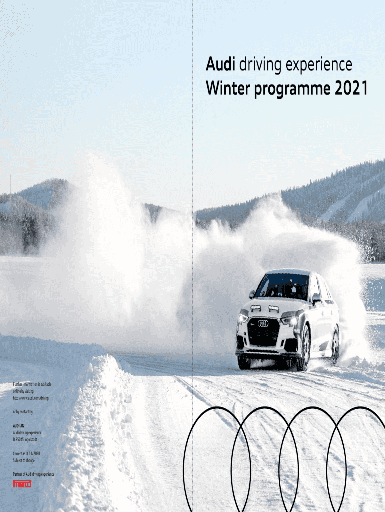 Audi driving experience Winter program 2021Further information is available online by visiting http://www.audi.com/driving or by contacting AUD IAG Audi driving experience D 85045 Ingolstadt Correct
