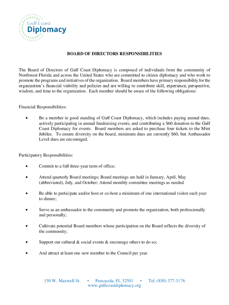 BOARD OF DIRECTORS Responsibilities Board of Directors of Gulf Coast Diplomacy is composed of individuals from the community of Northwest Florida and across the United States who are committed to
