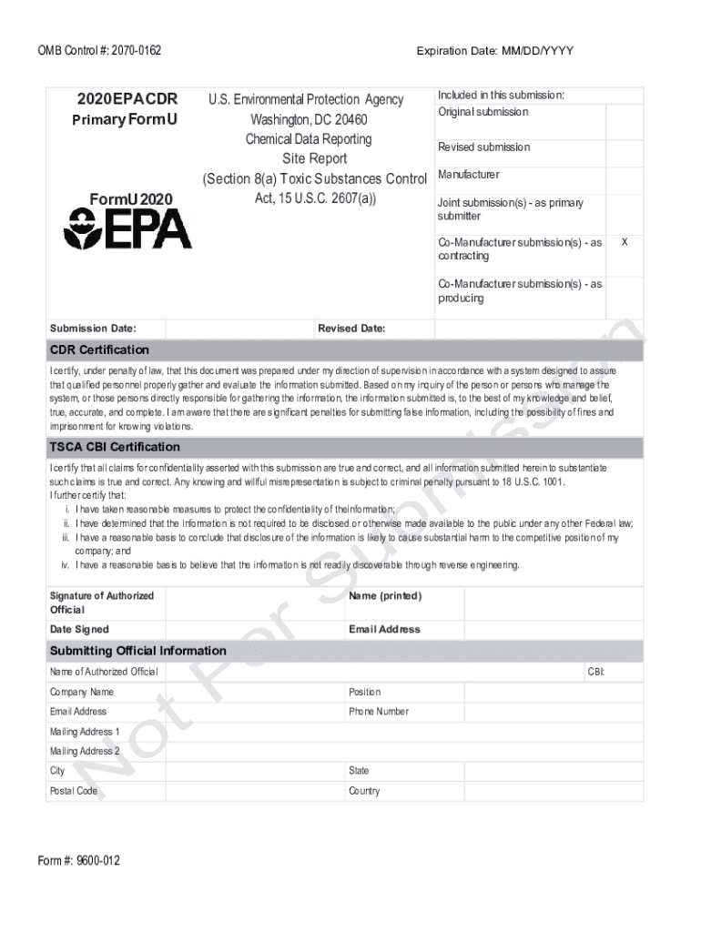 OMB Control #: 207001622020 EPA CDR Primary Form 2020Expiration Date: MM/DD/YYY. S. Environmental Protection Agency Washington, DC 20460 Chemical Data Reporting Site Report (Section 8(a) Toxic Substances