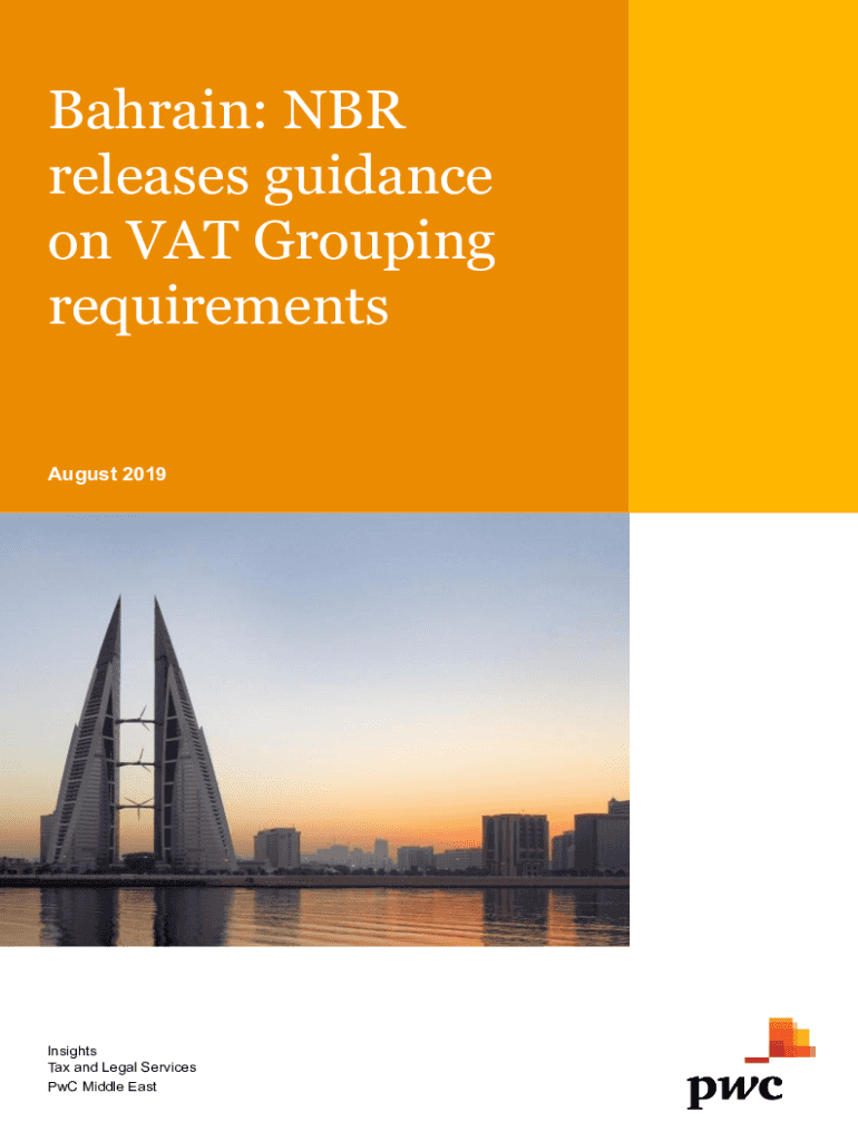 Bahrain: NBR releases guidance on VAT Grouping requirements August 2019Insights Tax and Legal Services PwC Middle ESSTIN brief Guidance on the VAT Grouping requirements The National Bureau for Revenue