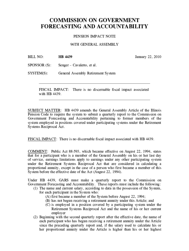 COMMISSION ON GOVERNMENT FORECASTING AND ACCOUNTABILITY PENSION IMPACT NOTE 96TH GENERAL ASSEMBLY BILL NO:HE 4439SPONSOR (S):Singer Canaletto, et al.SYSTEM(S):General Assembly Retirement System January