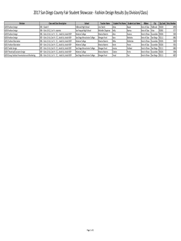 2017 San Diego County Fair Student Showcase Fashion Design Results (by Division/Class) Division 4200 Fashion Design 4200 Fashion Design 4200 Fashion Design 4200 Fashion Design 4201 Fashion Illustration