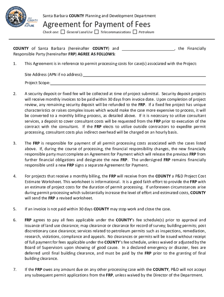Santa Barbara County Planning and Development DepartmentAgreement for Payment of Fees Check one:General Land UseTelecommunicationsPetroleumCOUNTY of Santa Barbara (hereinafter COUNTY) and ___, the